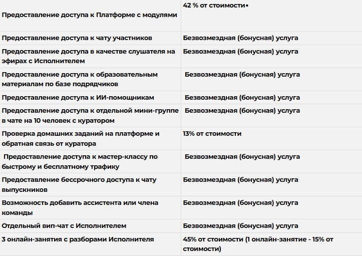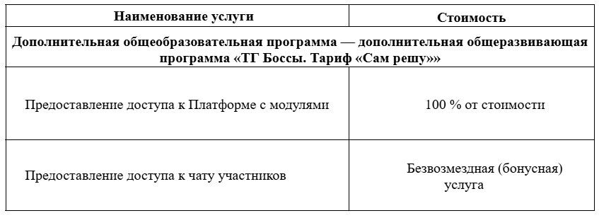 Услуги по обучению по дополнительной общеобразовательной программе — дополнительной общеразвивающей программе «ТГ Боссы. Тариф «Сам решу»» включают в себя: