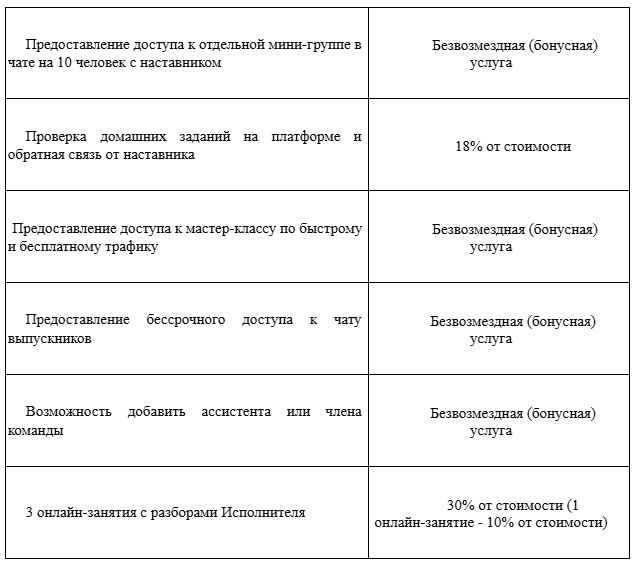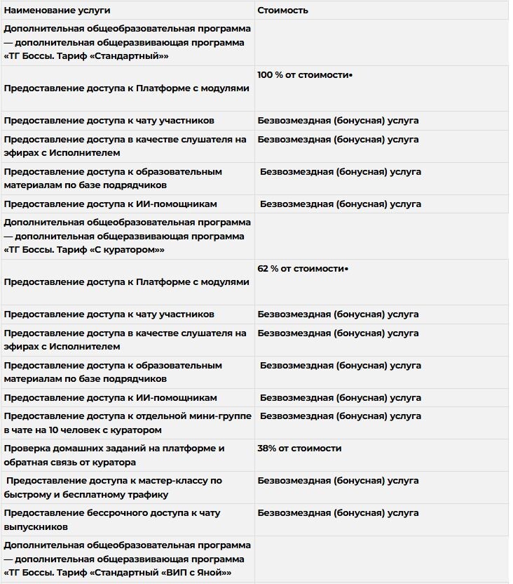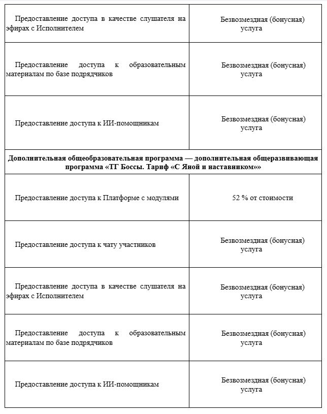 Услуги по обучению по дополнительной общеобразовательной программе — дополнительной общеразвивающей программе «ТГ Боссы. Тариф «С Яной и наставником»» включают в себя: